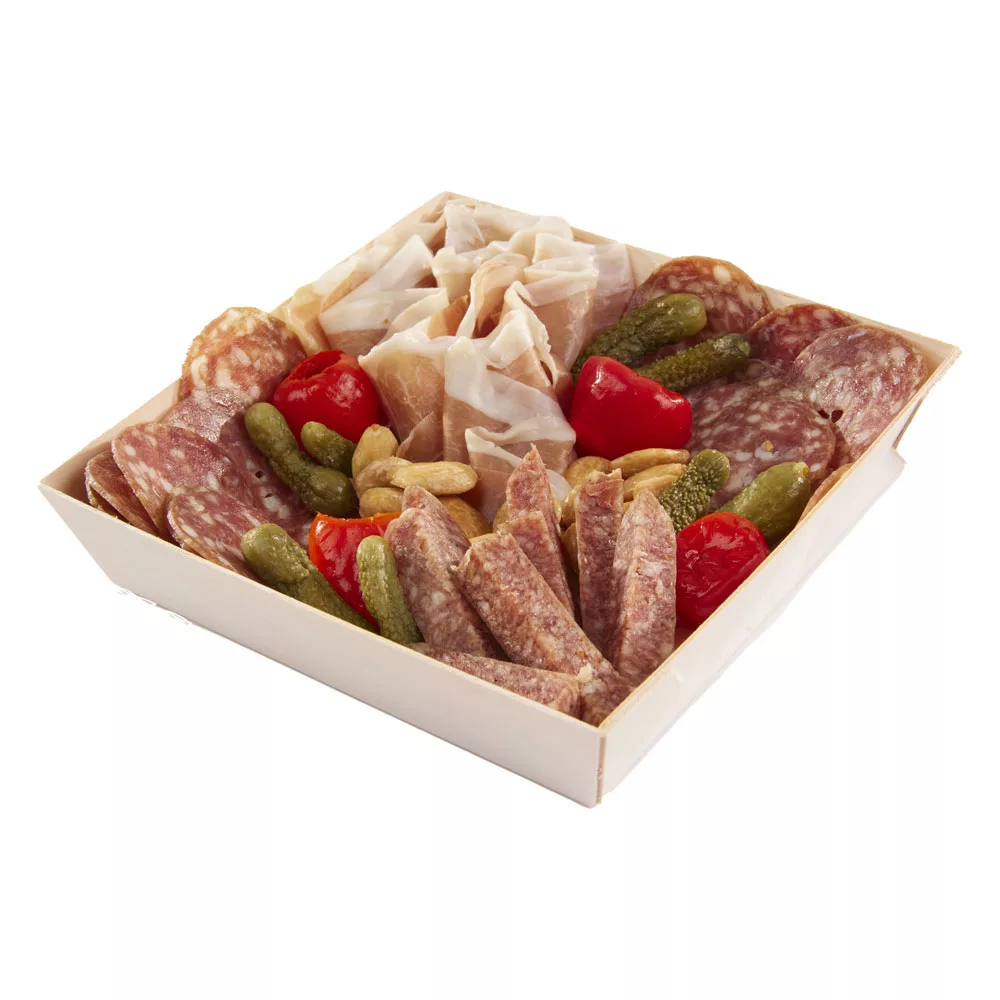 The perfect charcuterie plate for a smaller gathering: thin Prosciutto, sliced Genoa, and Finnochiona Salami accompanied by Spanish Almonds, Cornichons, and Peppadews.
