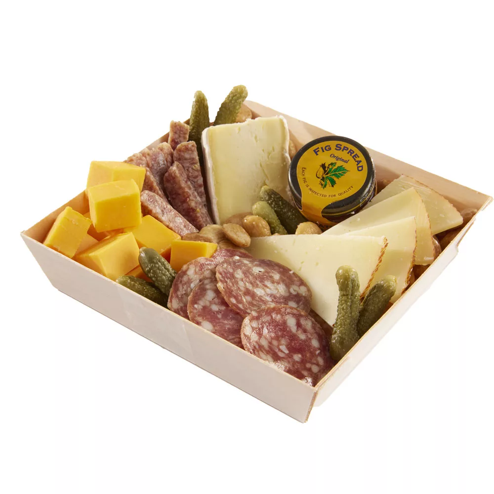 The perfect grazing plate for a smaller gathering: Brie, Manchego, Cheddar, Genoa and Finnochiona Salami accompanied by Fig Spread, Spanish Almonds, and Cornichons.