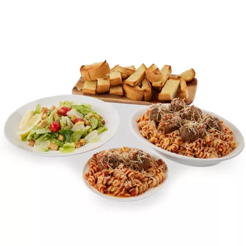 Beef & Fennel Meatballs with Bolognese over Fusilli, Garlic Bread, and Family Size Caesar Salad
