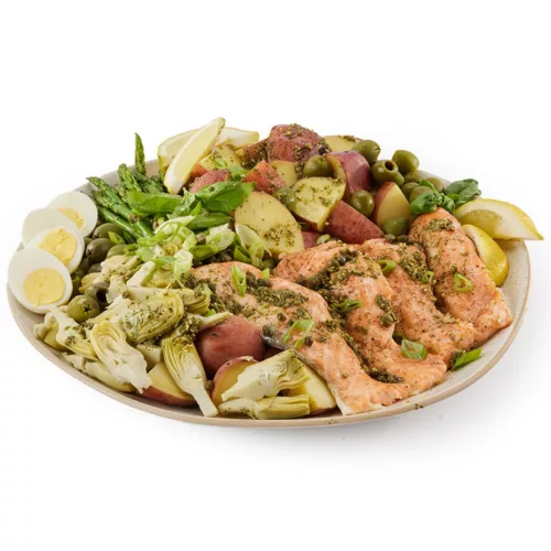 Roasted Salmon, Roasted Potatoes, Artichokes, Olives, Hard Boiled Eggs, Capers and fresh Lemon with Basil Pesto Drizzle.
