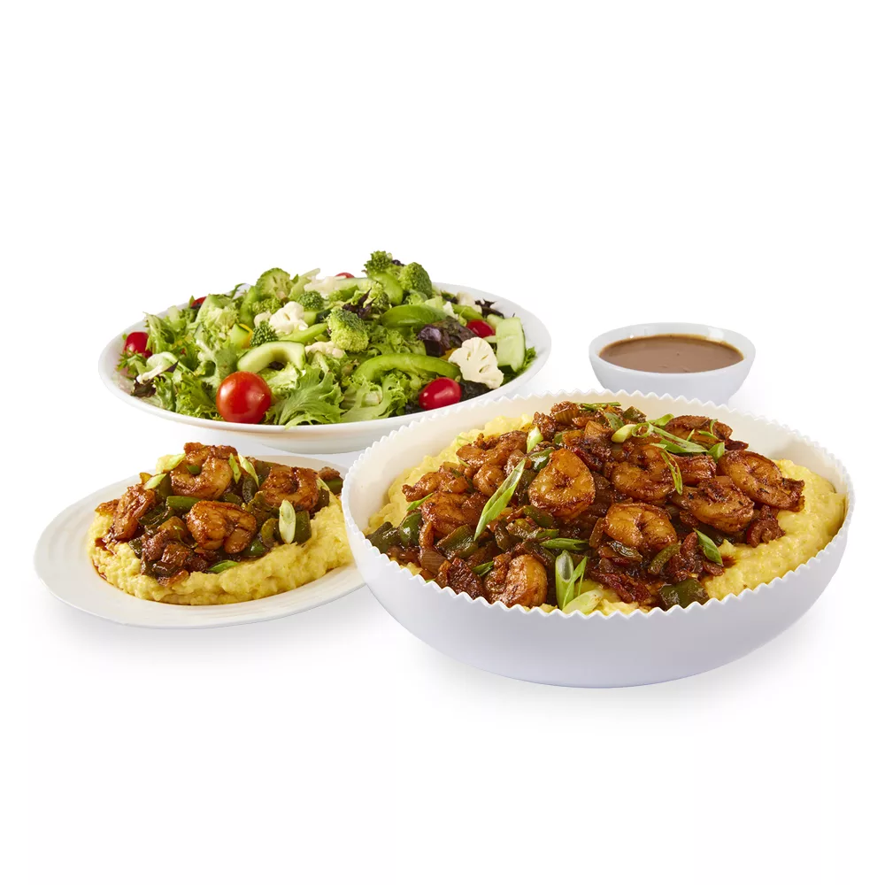 Creamy Cheddar Grits, Blackened Shrimp, Bacon, Bell Peppers, Onion. Garden Side Salad with Balsamic Vinaigrette