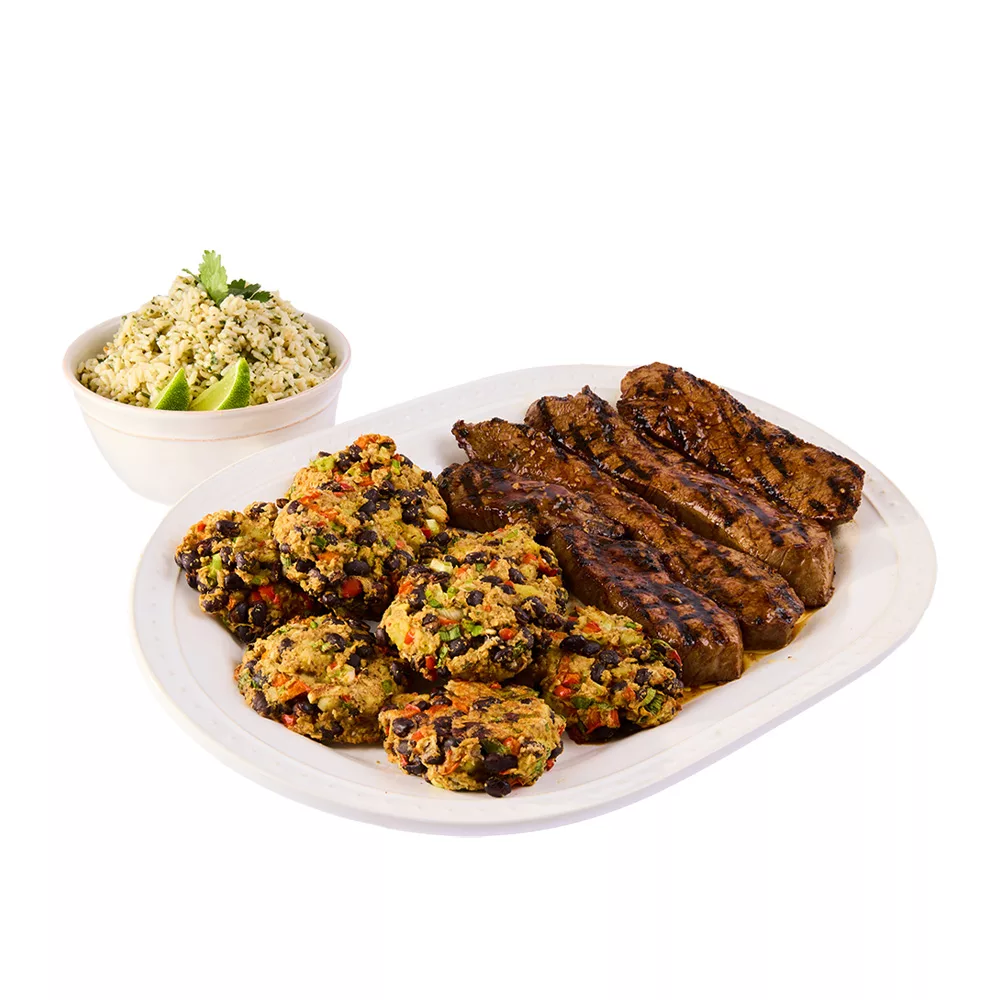Tri Tip, Caribbean Jerk Marinade, Black Beans & Sweet Potato Cakes and Tequila Lime Rice.