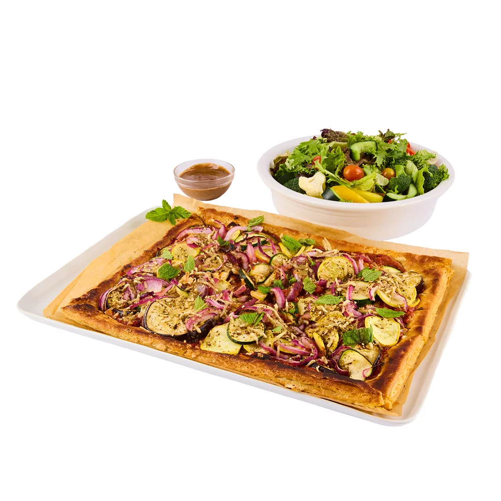 Tomatoes, Shallots, Garlic, Cumin, Cinnamon, Eggplant, Onion, Zucchini, Summer Squash, Vegan Puff Pastry, Za'atar and fresh mint