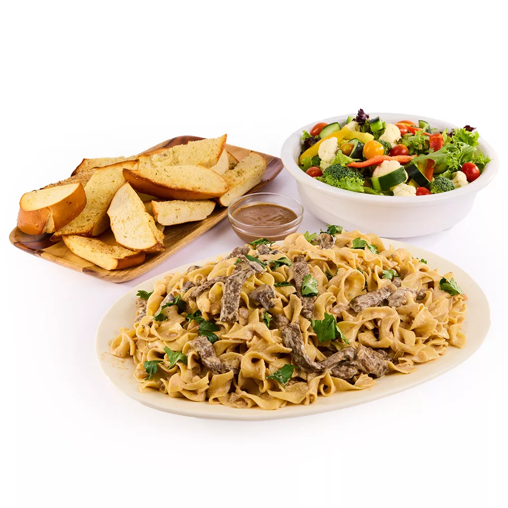 Egg Noodle, Sour Cream, Mushroom, Beef, Garlic, Mustard, Worcestershire Sauce, Parsley, lettuce, bell pepers, carrots, tomatoes, broccoli, cauliflower, cucumber, balsamic dressing.