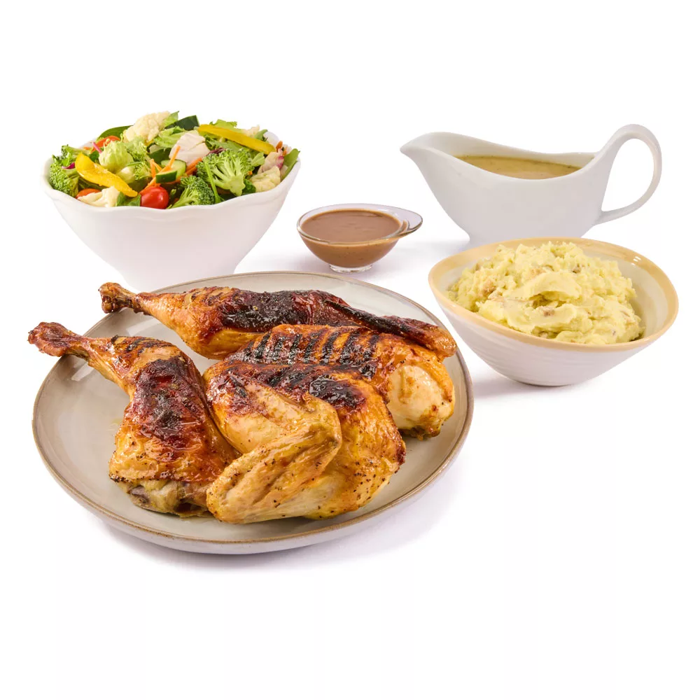 Spatchcock Chicken, Yukon Gold Mashed Potatoes, Poultry Gravy, Garden Salad.