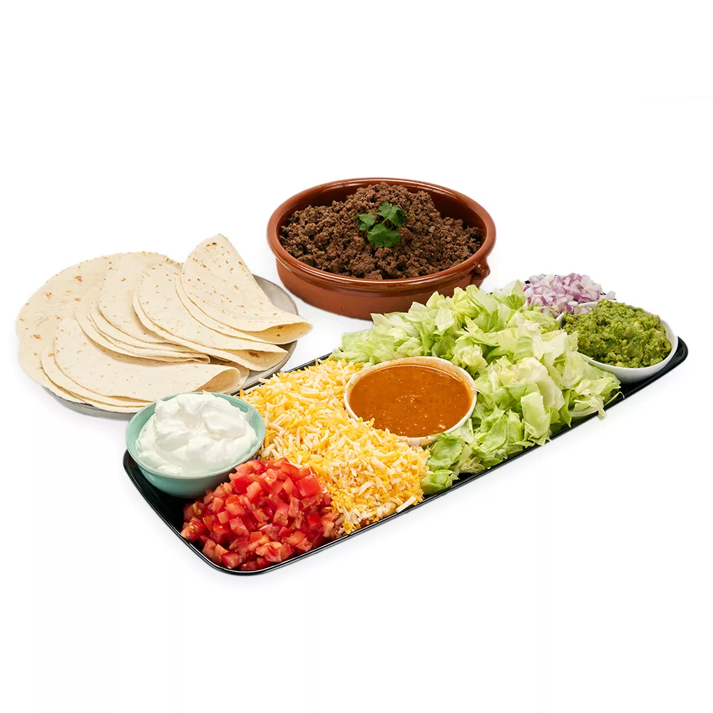 We've got your next taco night covered! This package comes with seasoned and ready to reheat ground beef and all the fixings: local corn or flour tortillas, cheese, lettuce, tomato, onion, sour cream, fresh guacamole and salsa.
