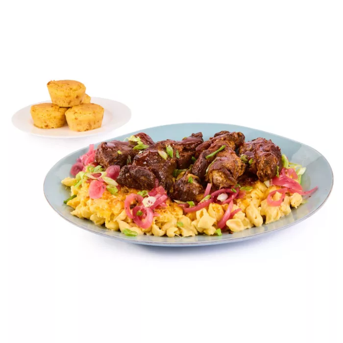 BBQ Spare Ribs, Mac & Cheese, Pickled Red Onion, Green Onion, Cornbread Muffins