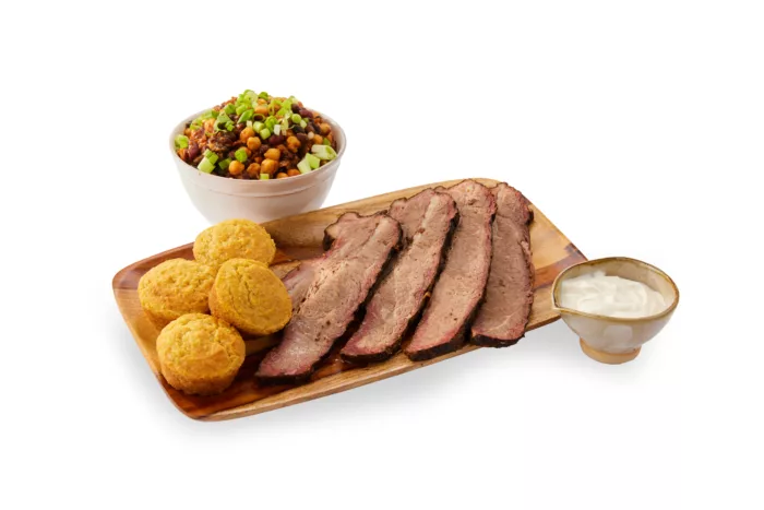 Heating Instructions: Covered with lid bake cornbread, brisket and beans at 350F until heated through. Garnish brisket and beans with green onions. Serve sour cream on side.