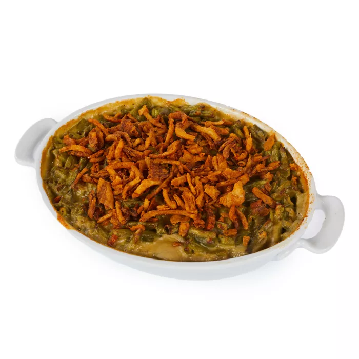 2 lb – A beautiful update to a classic dish! Our green bean casserole uses rich, earthy mushrooms, shallots and creamy mushroom gravy with tender-crisp green beans, all topped with crispy fried onions. 2 lbs serves 4 – 6