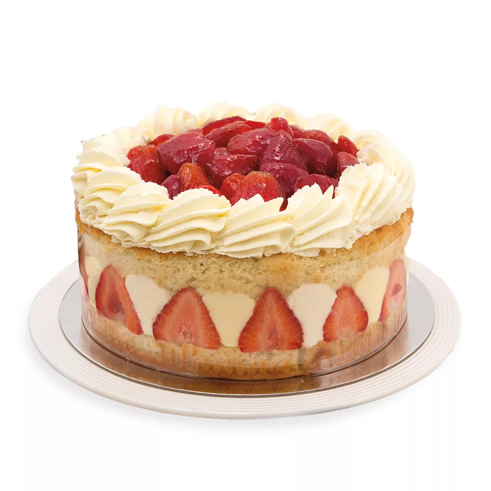 Layers of vanilla cake, custard and whipped cream, topped with fresh strawberries. Serves 8-10.
