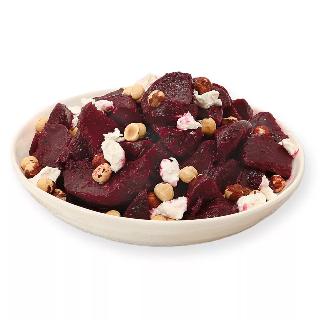Ingredients: Beets, canola oil, red wine vinegar, goat cheese, hazelnuts.