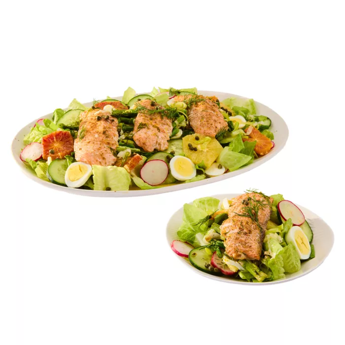 Ingredients: Arctic Kravoy Salmon (Salmon), Lettuce Romaine Chopped, Orange, Artichoke Hearts Quartered (ARTICHOKE HEARTS, WATER, SALT AND CITRIC ACID AND/OR ABSORBIC ACID), Cucumber, Egg Hard Boiled (Egg), Vinegar White Balsamic (WHITE WINE VINEGAR (SULFITES), CONCENTRATED GRAPE MUST, BALSAMIC VINEGAR OF MODENA (1%) (SULFITES).), Honey (Honey), Radish Sliced, Safflower Oil (SAFFLOWER OIL), Capers Drained, Oil Extra Virgin Olive, Dill Fresh, Salt Kosher Coarse (SALT, YELLOW PRUSSIATE OF SODA), Spice Pepper Black Coarse, Spice Ground Cumin, Coriander Ground
