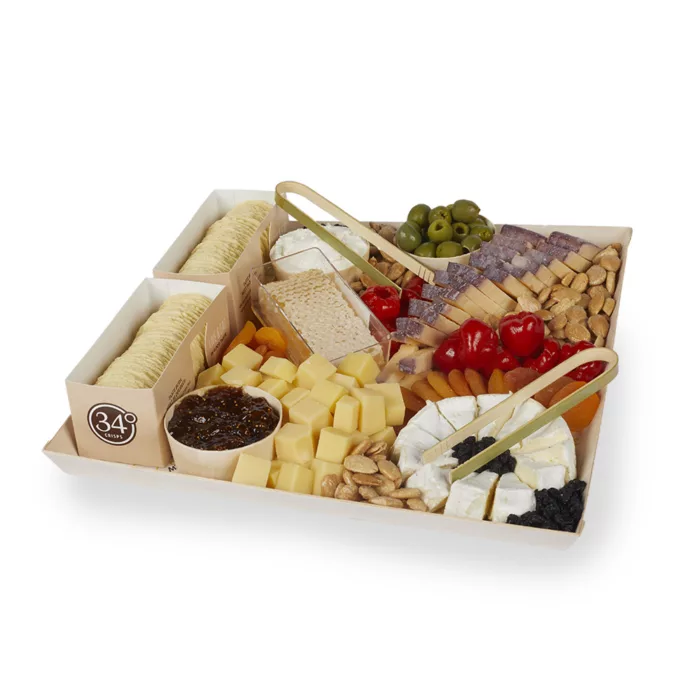 Ingredients: Brie (pasteurized milk&cream, salt, calcium chloride, microbial enzymes, bacterial culture, penicillium candidum), Bellavitano Merlot (Pasteurized Milk, Cheese Cultures, Salt, Enzymes, Grapes, Water, Yeast), Chevre (pasteurized cultured goat milk, salt, enzymes), Jarlsberg (Pasteurized part-skim milk, cultures, salt, microbial rennet), Fig Jam (Figs (Water, Dried Figs), Sugar, Fruit Pectin, Citric Acid, Lactic Acid, Ascorbic Acid), 34 Degrees Crisps (Enriched wheat flour [wheat flour, malted barley flour, niacin, iron, thiamin mononitrate (vitamin B1), riboflavin (vitamin B2), folic acid], natural cheese flavor, sesame seeds, salt), Valencia Almonds (Valencia Almonds, Olive Oil, Sea Salt, Sunflower Oil), Dried Blueberries (PLU 17873), Dried Apricots (apricots, rice flour (anti-caking), sulphur dioxide (color)), Castelvetrano Olives (olives, water, salt, acidity stabilizer: lactic acid, antioxidant: ascorbic acid, may contain pit fragments), Honeycomb, Peppadews (Juanita peppers, water, sugar, vinegar, salt, citric acid, ascorbic acid, calcium chloride.