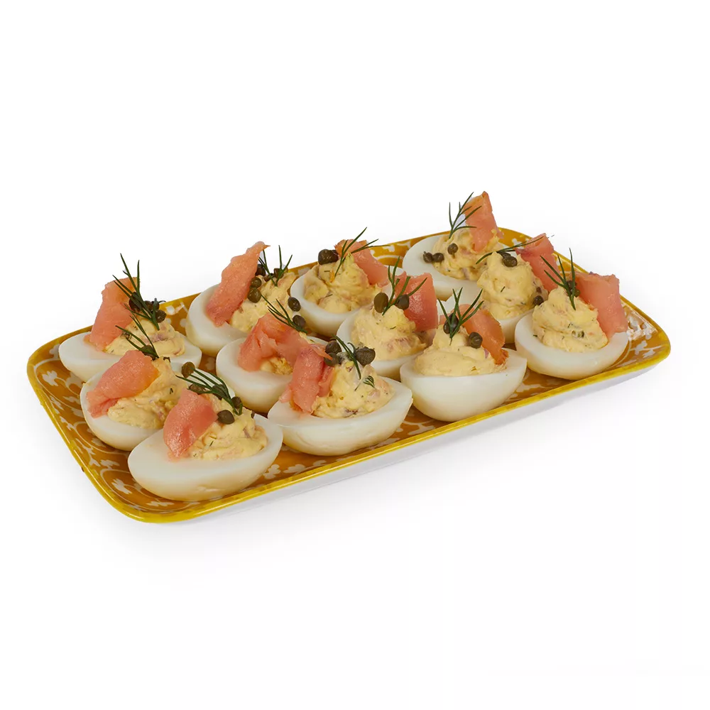 12-pack – Deviled eggs with smoked salmon, herbs and capers.