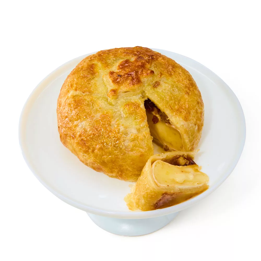 Double-crème Brie coupled with fig spread and walnuts, then wrapped in buttery puff pastry and baked until golden brown.