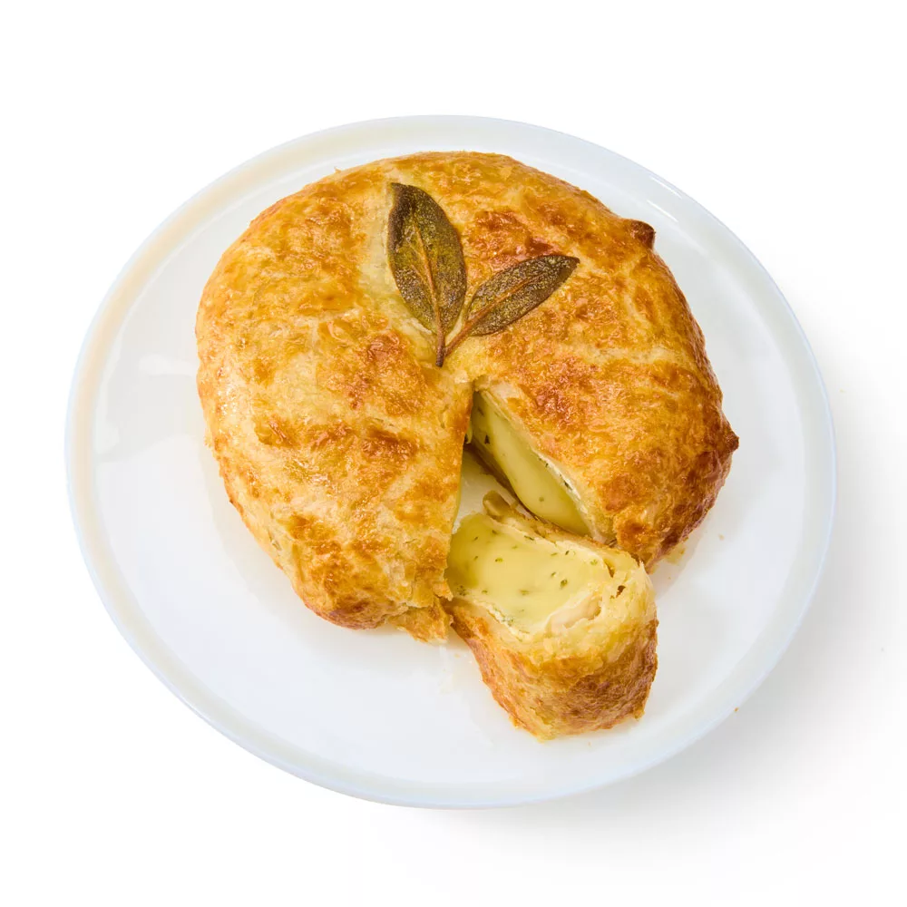 Double-crème Brie flavored with garlic and herbs, then wrapped in buttery puff pastry and baked.
