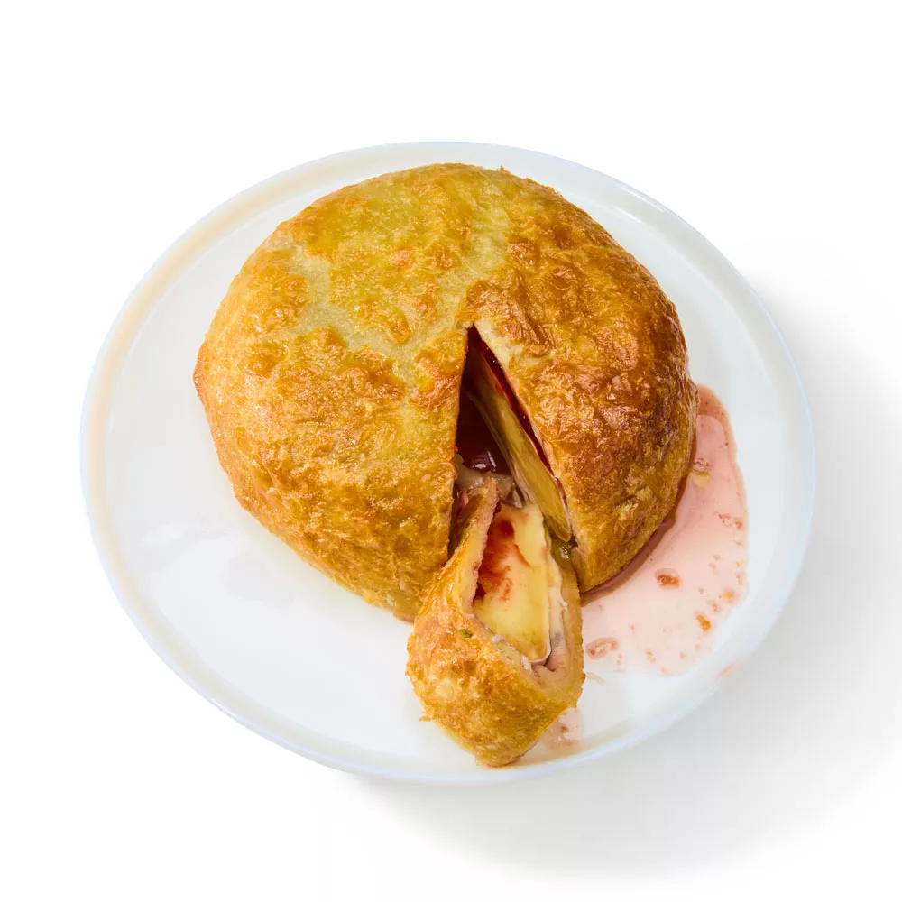 Double-crème Brie coupled with sour cherry spread, then wrapped in buttery puff pastry and baked and baked until golden brown.